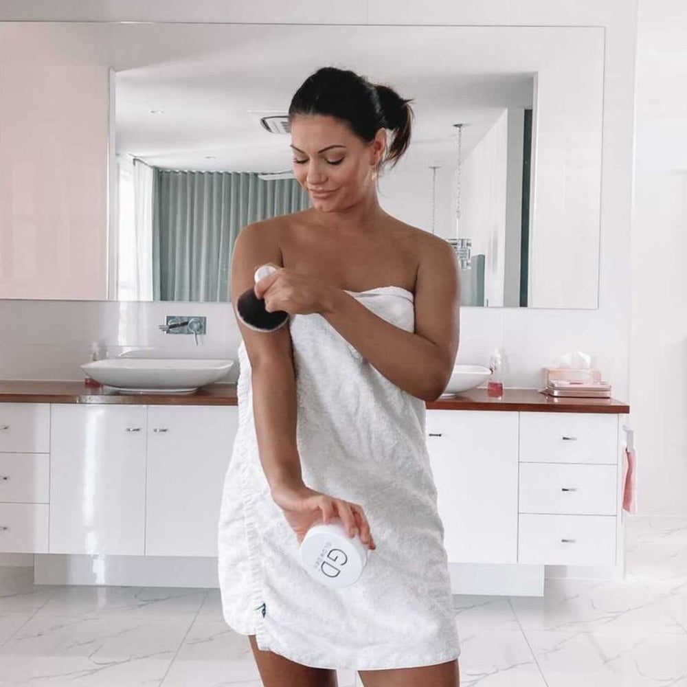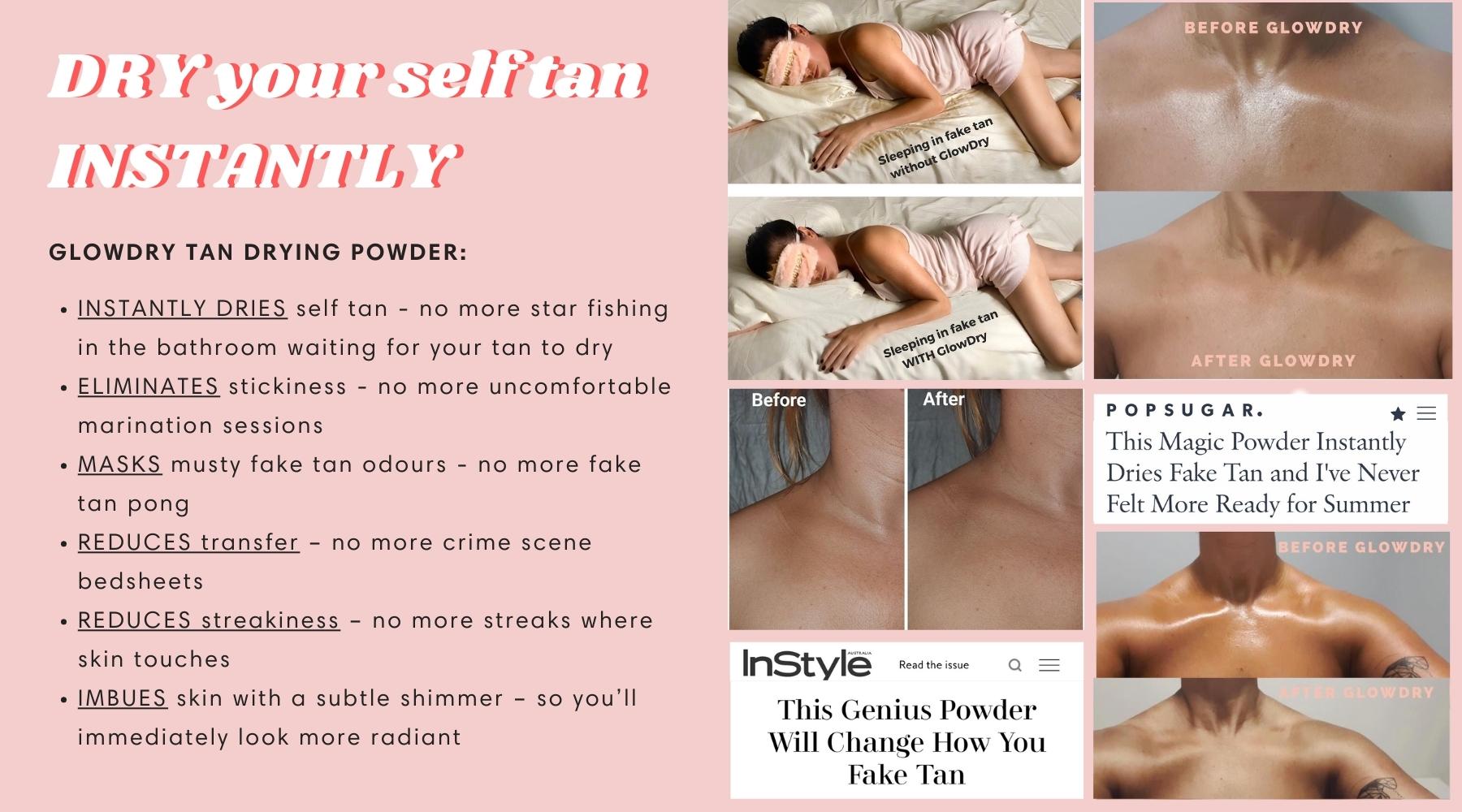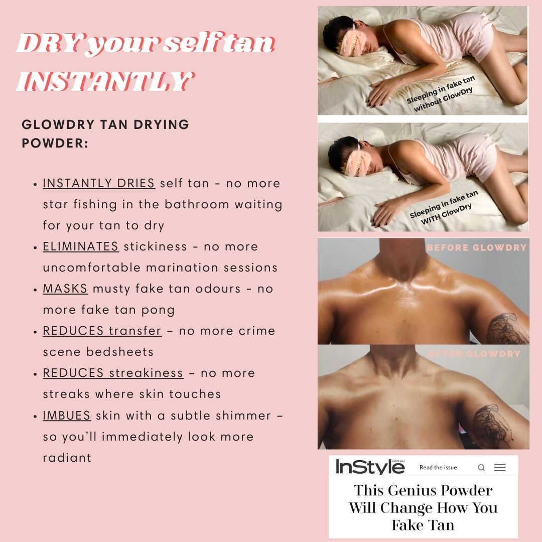 Sticky fake tan? Set and forget with GlowDry! Australia’s first fake tan drying powder, GlowDry sets your self-tan in a flash – so you can get on with your life. Talc-free and vegan-friendly, our award-winning, summer scented formula removes the stress and mess from tanning. DON'T GLOW WITHOUT IT!